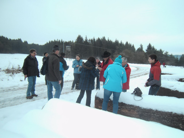 Pünktlich um 9.30 Uhr verließ eine stattliche Gruppe von etwas über 20 Personen Beilngries zu Fuß. Vorbei am Golfplatz ging es durch den verschneiten Winterwald, hinauf auf die Kevenhüller Anhöhe. Dort gab es den obligatorischen "Gipfelschnaps". Weiter ging es bis nach Kevenhüll, dort stießen die Sangesbrüder Adolf Biedermann und Andreas Schöls zur Gruppe. Dem Enkel eines Sangesbruders löste sich zu diesem Zeitpunkt bereits die Sohle seines Wanderschuhes. Andreas Schöls war hilfsbereit und half mit Ersatzschuhen aus, die aber zwei Nummern zu klein waren. Und so hat sich der junge Mann bis Oberbürg zwei kräftige Blasen gelaufen, somit fiel er für die Rückwanderung aus.