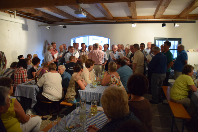 Am Samstag, 25.7.2015, feierte der Verein sein Sommerfest. Die Sänger vom 1. Tenor hatten unter Leitung ihres Stimmensprechers, Arno Dengel, das Fest vorbereitet. Das Alte Feuerwehrhaus konnte die etwa 70 Besucher kaum aufnehmen. Manche Bierbänke waren mit fünf Personen besetzt. Kulinarisch stand eine hervorragend gegrillte Sau, die Sangesbruder Max Künzel anlässlich seines Geburtstages, siehe oben, gestiftet hatte, im Mittelpunkt. Gesanglich im Mittelpunkt stand natürlich der MGV selbst, dessen Sänger den Damen und sonstigen Besuchern ein paar Lieder sangen. Als besonderen Gast begrüßte Chorleiter Vieracker den ehemaligen Sänger Hans Wild, den er auch zum Mitsingen bewegen konnte. Zur Unterhaltung trug Volker Hampel mit Gedichten bei. Das vom 1. Tenor und seinen Damen vorbereitete Salate- und Kuchenbüffet war eigentlich umfangreich, wurde aber samt Sau restlos vertilgt. Offensichtlich gingen Musik und Stimmung durch den Magen.