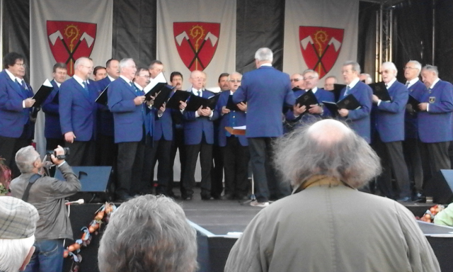 Der MGV war aufgefordert, die Besucher vor dem Rathaus mit einigen Liedern zu unterhalten. Die Bühne war auf dem Kirchplatz, etwas zurückversetzt von der Hauptstraße aufgebaut. Der Chor war in starker Besetzung angetreten. Piano war nicht angesagt. Manche Sänger gaben alles, um die Zuhörer trotz der im Freien immer schwierigen Akustik, dem weiten Raum und den zusätzlichen Konkurrenzgeräuschen zu erreichen. Dies gelang leidlich. Zur Belohnung gab es einen Verzehrgutschein.
