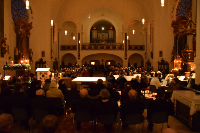 Bekanntlich ist die Akustik in der Pfarrkirche nicht die allerbeste. Was für die Zuhörer dennoch ein schönes musikalisches Erlebnis war, erwies sich für den MGV dank seiner Aufstellung im hinteren Teil des Chores als ein akustisches Elend. An diesem Ort versanken abgesehen von der Flötengruppe alle anderen Darbietungen im Brechungsbrei akustischer Nebenwellen, die der Kirchenraum noch bereit war, dorthin dringen zu lassen. Schwierig war auch der eigene Gesang, da kaum der Nebenmann, geschweige die anderen Stimmen ordentlich zu hören waren. Ein Konzertsaal ist die Stadtpfarrkirche nicht.
