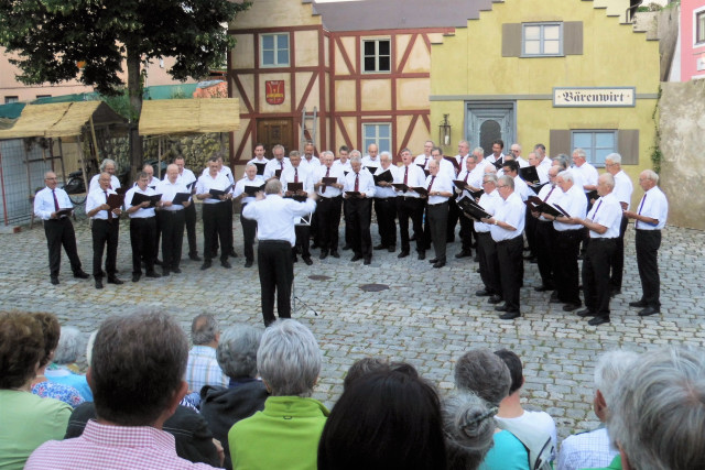 Am Mittwoch, 20.7.2016, folgten 30 Sänger der Einladung des dortigen Patenvereins MGV Liederkranz Kipfenberg zu deren Marktplatzsingen. Auf dem Marktplatz waren eine Historische Kulisse und eine Zuschauertribüne für ein Theaterstück aufgebaut, die die beiden Chöre für ihren Auftritt nutzen konnten. Vor etwa 70 Zuhörern sangen die beiden Chöre im Wechsel jeder zwei Blöcke von jeweils drei bzw. zwei Liedern. Zum Abschluss gab es drei gemeinsame Lieder. Armin Krempel dirigierte die Beilngrieser, Johannes Mecking seine Kipfenberger und den Gesamtchor.