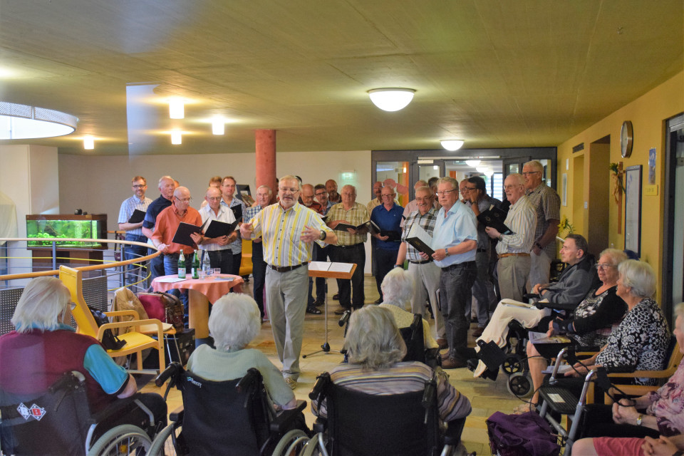 Aus seinem vierstimmigen Standardrepertoire sang der Chor dazwischen immer wieder Lieder ohne Unterstützung des Publikums, so zum Beispiel "Tiritomba", "Ännchen von Tharau" und "Das Lieben bringt groß' Freud". Auch ein "Ausländer" sollte nicht fehlen, "Sing a Song of Cities". Die Sänger wurden schließlich nach einem anstrengenden Auftritt, denn so lange muss man selten stehen und es war recht warm im 2. Stock, mit freundlichen Worten und einer Geldgabe von Pflegedienstleiterin Marina Bär und mit einem herzlichen Applaus von den Bewohnern verabschiedet.