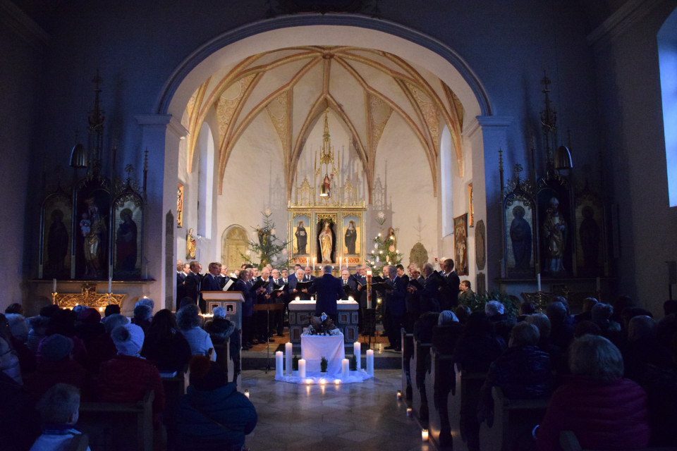 Die Friedhofskirche war tatsächlich so gut gefüllt, dass einige Zuhörer mit Stehplätzen vorlieb nehmen mussten. Alois Vieracker zeichnete die Weihnachtsgeschichte in kurzen Texten nach und leitete somit zwischen den Liedern über. Er erinnerte auch an die lange Tradition des Weihnachtssingens, mit dem der Verein auch seiner verstorbenen Mitglieder gedenke. Gesungen wurde: "Weihnacht wird's nun wieder", "Aus einer schönen Rose", "Schweig fein still!", "Heut kam ein Engel" (aus Ungarn), "Little Drummer Boy", "Tochter Zion, freue dich", "In Bethlehem die Nacht", sowie "Stille Nacht, heilige Nacht".