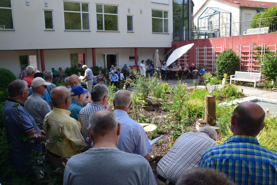Das Publikum, bestehend aus vielen Bewohnern des Seniorenzentrums, sowie mehreren Pflegekräften und Angehörigen, war bereits im Tiefgarten des Komplexes an der Westseite im Schatten versammelt. Wegen der starken Sonneneinstrahlung nahmen der Chor und Akkordeonbegleiter Georg Nuber ebenfalls im Schatten Aufstellung. Da nur noch die Südseite des Gartens übrigblieb, war die Aufstellung weder von der Akustik noch zum Dirigieren sehr günstig.