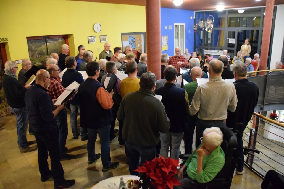 Dienstag, 9.12.2025. Sehr viele Bewohnerinnen und Bewohner des Seniorenzentrums waren auf den drei Ebenen des Hauses versammelt, um den Adventsliedern des MGV zu lauschen, der auf der mittleren Ebene im 1. Obergeschoss Aufstellung genommen hatte. Vor lauter Rollstühlen kam man kaum zum ehemaligen Sänger Georg Gietl durch, wenn ihn ein Sänger persönlich begrüßen wollte. Der Chor sang eine halbe Stunde lang die bekannten Lider aus seinem Adventsrepertoire. Es klang kraftvoll und sehr schön und die ebenfalls zahlreiche Sängerschar erntete verdienten Applaus. Nach dem Liedervortrag wünschten Alois Vieracker und danach Marina Bär allen Anwesenden eine schöne Advents- und Weihnachtszeit und die Heimleiterin versäumte nicht, den Verein für den nächsten Sommer um einen Besuch zu bitten. Im Anschluss begaben sich viele Sänger in das Gasthaus zur Mauth, um den Abend gemütlich ausklingen zu lassen.